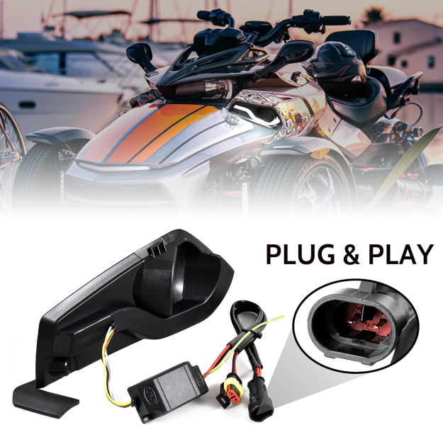 - Интегрированный дизайн вокруг противотуманных фар может очень хорошо защитить противотуманные фары, не блокируя при этом луч противотуманных фар, это сделает ваш Spyder более привлекательным и более безопасным для дополнительных дневных ходовых огней и дизайна в стиле струящейся воды, осветит тропа в сумерках и ночью, сопровождайте вождение