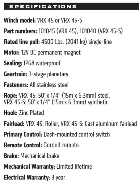 Мощность VRX составляет от 2500Lbs до 4500Lbs. что делает их хорошим вариантом как для квадроциклов, так и для UTV. Будет доступно 6 вариантов лебедок VRX25, VRX35, VRX45 и как всегда с возможностью выбора между синтетическим тросом и металлическим